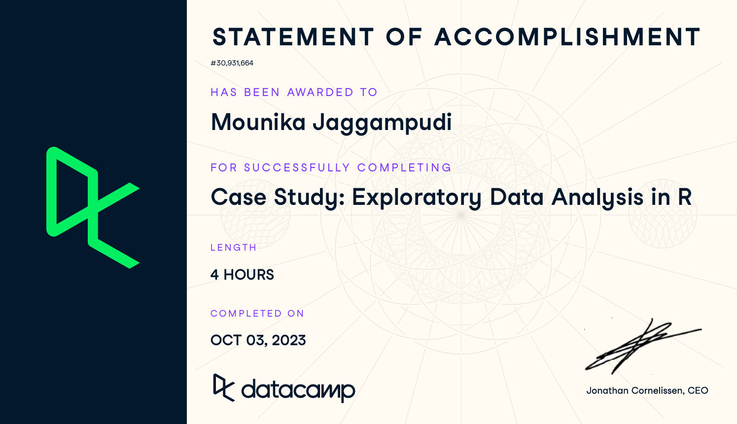 Details: Completed the “Case Study: Exploratory Data Analysis in R” course, demonstrating proficiency in performing exploratory data analysis (EDA), uncovering insights, and visualizing data effectively using R.