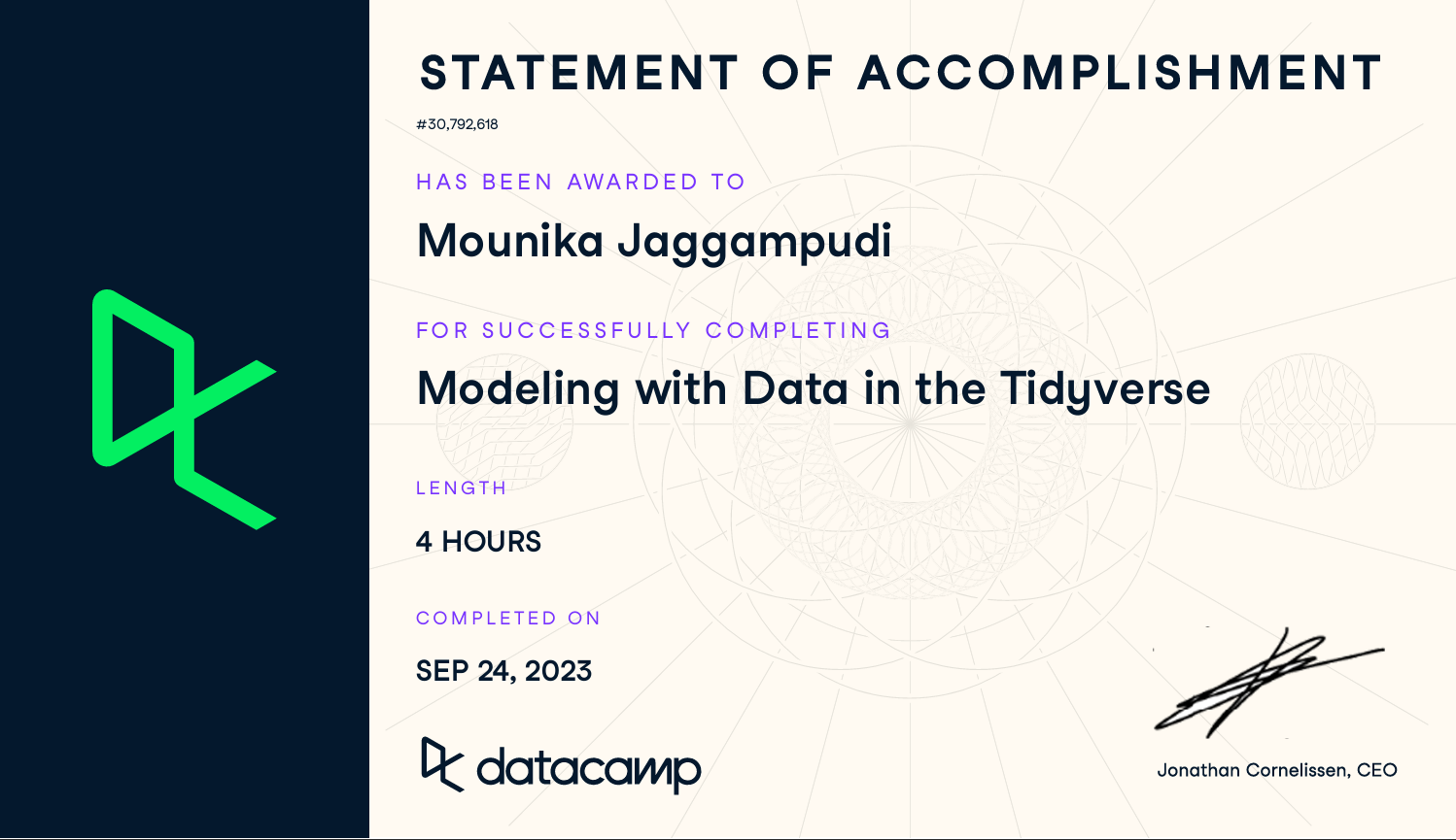 Details: Completed the “Modeling with Data in the Tidyverse” course, focusing on advanced data modeling techniques, data manipulation, and visualization using the Tidyverse package in R.