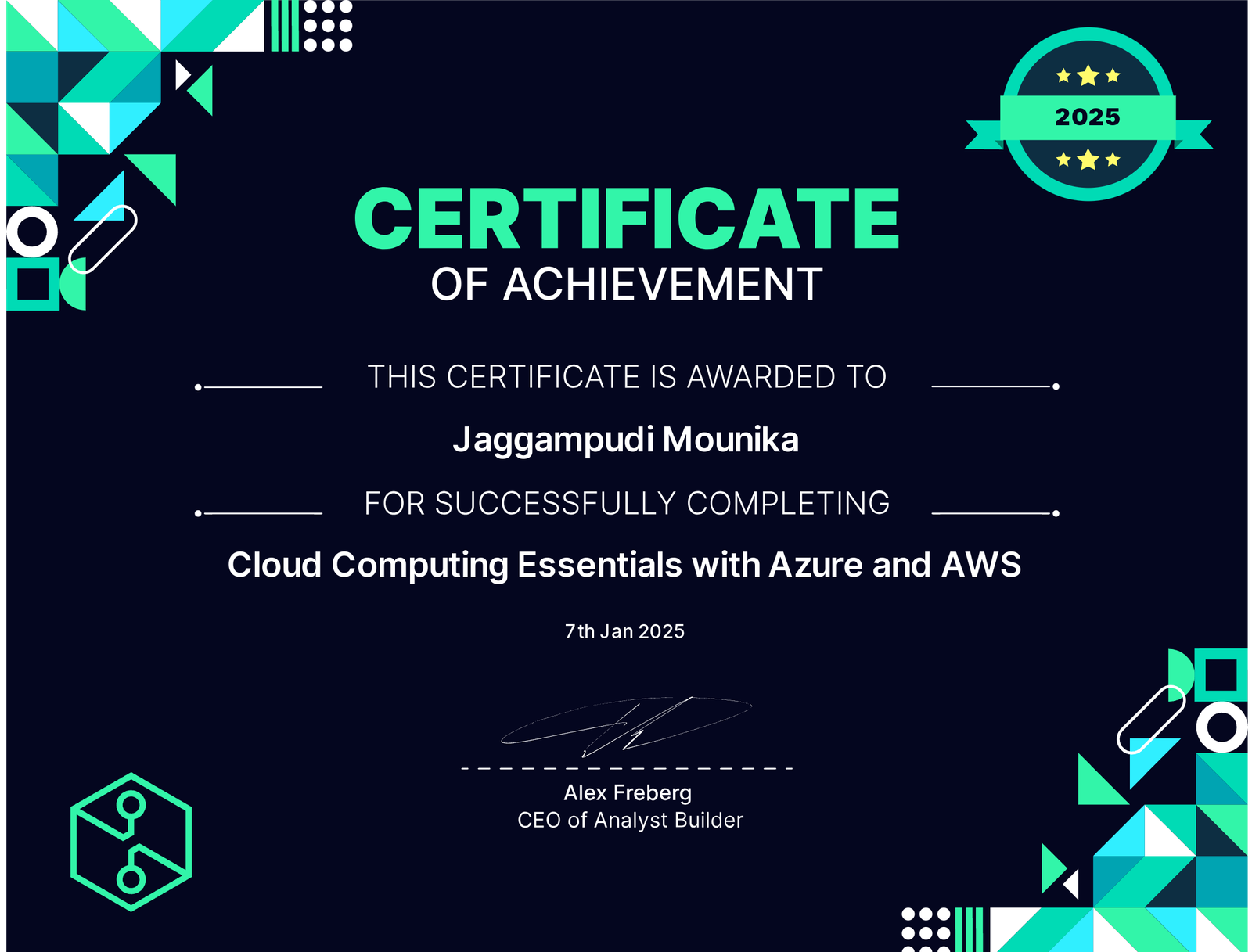 Details: Completed the “Cloud Computing Essentials with Azure and AWS” course, covering the fundamentals of cloud computing and its applications using Azure and AWS platforms.